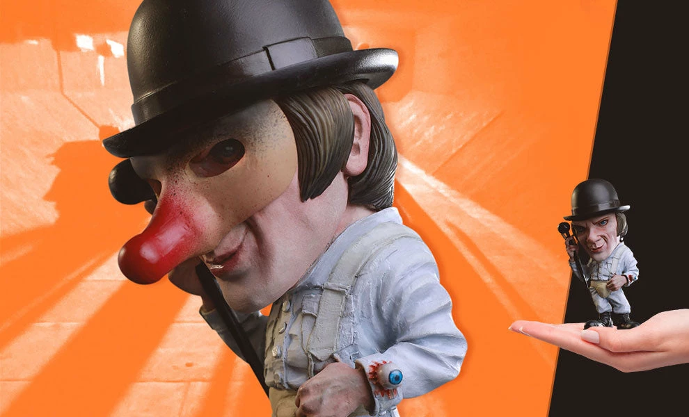 Star Ace is proud to present the first Defo Real figure from the Stanley Kubrick classic film,ย A Clockwork Orange. Alex DeLarge, as portrayed by Malcolm McDowell, was a juvenile delinquent prone to โulta-violenceโ and anti-social behavior. This Defo Real features the realistic head of Alex on a stylized body dressed in his classic white gang costume and his bowler hat, and carrying a cane. A long-nosed mask magnetically attaches to the face.