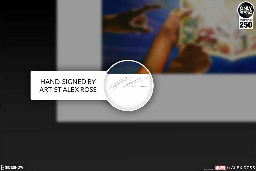 Originally designed as the primary cover for Marvel Comics #1000 (2019), written and drawn by 80 different creative teams in celebration of Marvel’s 80th anniversary, this vibrant composition is now available to fans as a fine art collectible exclusively through Sideshow. Each Marvel Comics #1000 Fine Art Lithograph is hand-signed by Alex Ross and includes a Certificate of Authenticity as a part of the limited edition of 250 pieces.