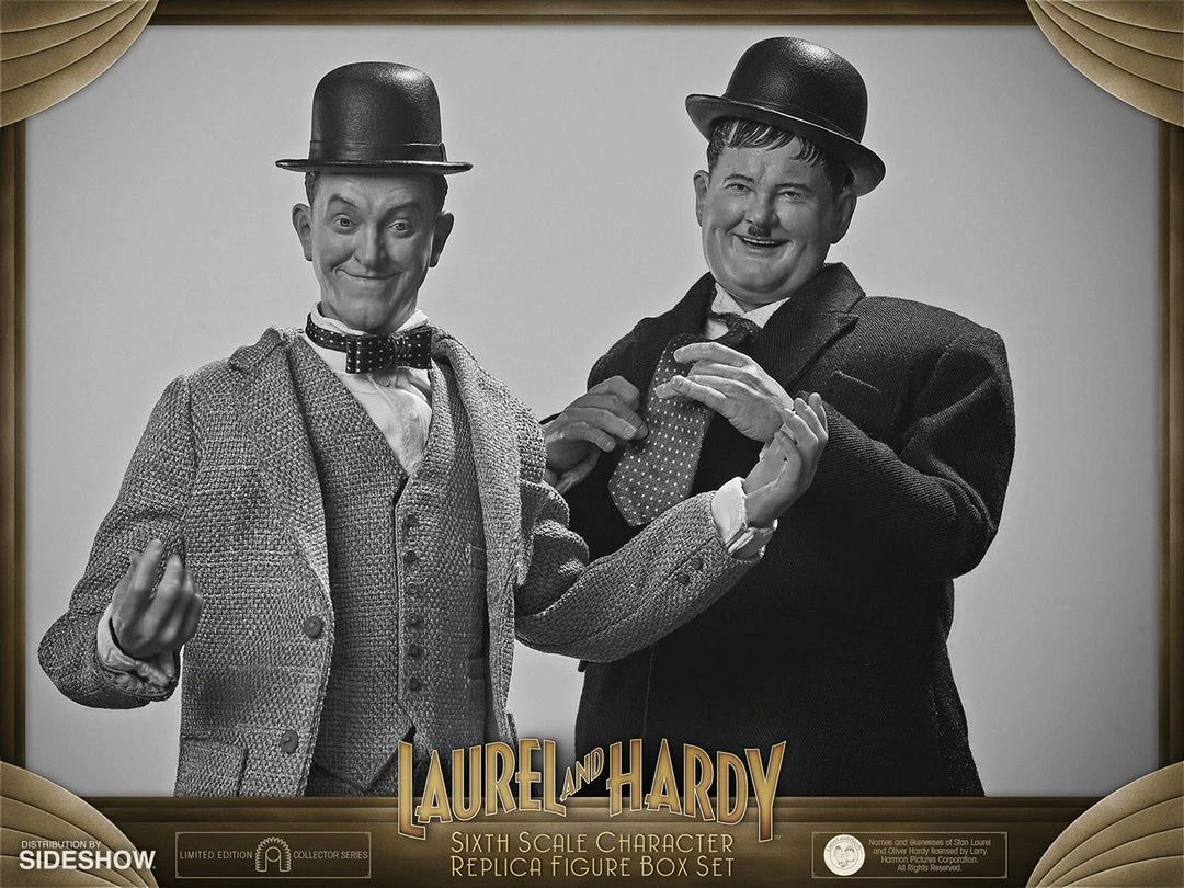 The Stan Laurel and Oliver Hardy Sixth Scale Replica Figure Box Set features: